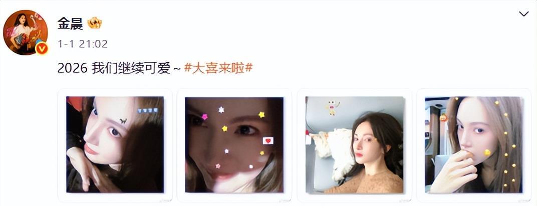 金晨是舞蹈演员出身,早年凭利落的肢体线条在舞台攒下辨识度,后来转型影视、站上《乘风破浪的姐姐》舞台,也总带着 “动作精准到毫厘” 的飒爽。可私下的她,总爱用软萌细节藏住这份锐利。2026 年元旦,她发的这组带可爱贴纸的动态,一句 “2026 我们继续可爱”聚合财富,刚好把舞台的舒展和生活的软萌,揉在了每一张闪着装饰的画面里。